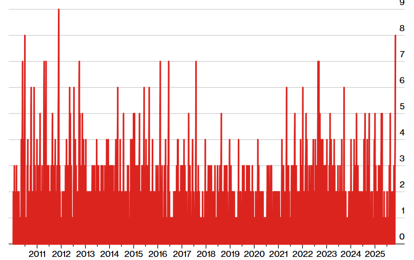 Снижение отражает изменение настроений в отношении ИИ-компаний, которые ранее поддерживали рост рынка. Индекс Nasdaq 100 и Bloomberg Magnificent 7 Total Return теряют около 4% за неделю — это может стать их крупнейшим недельным падением с апреля.