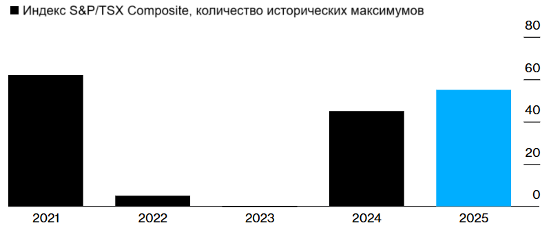 Канадский фондовый индекс на пути к рекордному числу максимумов с 2021 года