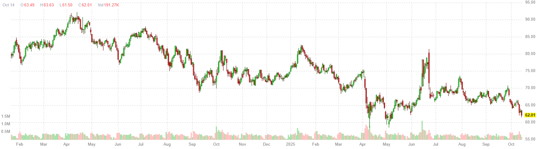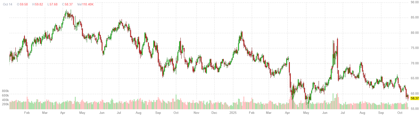 Цены на нефть во вторник ушли в минус, приблизившись к пятимесячному минимуму, на фоне обострения торговых трений между США и Китаем и пересмотра прогнозов Международным энергетическим агентством. Давление на рынок усиливают санкции, тарифные угрозы и ожидания роста предложения со стороны OPEC+.