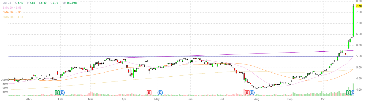 Акции финской Nokia (NOK) выросли на 20% после того, как компания объявила о стратегическом партнёрстве с Nvidia (NVDA). Американский производитель чипов инвестирует $1 млрд. в обмен на более чем 166 млн. новых акций. Привлечённые средства будут направлены на развитие инициатив в области искусственного интеллекта и общие корпоративные цели.
