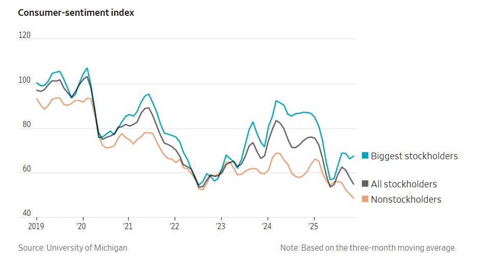 Согласно индексу настроений Мичиганского университета, американцы с крупными инвестиционными портфелями настроены в отношении экономики заметно лучше, чем те, кто не владеет акциями (см. график выше). Настроения среди людей, не владеющих акциями, находятся на самом низком уровне по сравнению с трёхмесячной скользящей средней с тех пор, как университет начал отслеживать их в 1998 году.