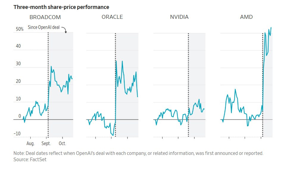 Интересная статья в WSJ о том, как растет финансовая пирамида, выстраиваемая Сэмом Альтманом и несколькими странными и честолюбивыми CEO компаний – производителей чипов (Nvidia, AMD, Oracle, Broadcom).