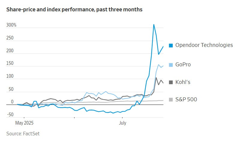 Темпами, напоминающими историю с memo stocks растет цена акций некоторых компаний. Стоимость акций онлайн-компании Opendoor Technologies, занимающейся перепродажей недвижимости, взлетела примерно на 377% за последний месяц, несмотря на стагнацию рынка жилья США. Одним из лидеров роста акций во вторник стал универмаг Kohl’s, который долгое время проигрывал конкурентам и неоднократно менял CEO. В среду фаворитами публики стали такие необычные компании, как GoPro и Krispy Kreme: производитель камер и производитель пончиков за неделю продемонстрировали впечатляющий рост (рис.выше).