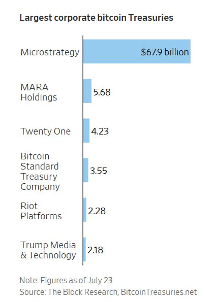 Цены на Ethereum и Bitcoin резко выросли в последние недели благодаря политике Трампа и растущему признанию криптовалют со стороны основных финансовых институтов. Однако появилась и новая группа покупателей: публичные компании, которые накапливают биткоин, фактически превращая свои акции в кредитную ставку на криптовалюту (см. рис. выше). В их число входит Trump Media & Technology Group, которая в понедельник объявила о накоплении около $2 млрд в биткоинах и связанных с ними ценных бумагах в рамках ранее объявленной «стратегии казначейства биткоинов». Критики предупреждают, что такая практика может усилить риски на рынке криптовалют, усилив распродажи. Эти предупреждения не помешали примерно пяти десяткам компаний следовать аналогичным стратегиям.