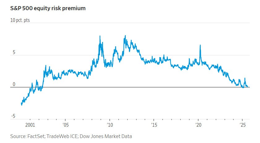 По моему мнению, самым тревожным сигналом является обнуление показателя excess cape yield. Премия за риск акций, определяемая как разница между прогнозируемой доходностью S&P 500 и доходностью 10-летних казначейских облигаций, близка к нулю (рис.). Это означает, что дополнительная доходность от владения акциями по сравнению с облигациями с низким риском практически сошла на нет.
