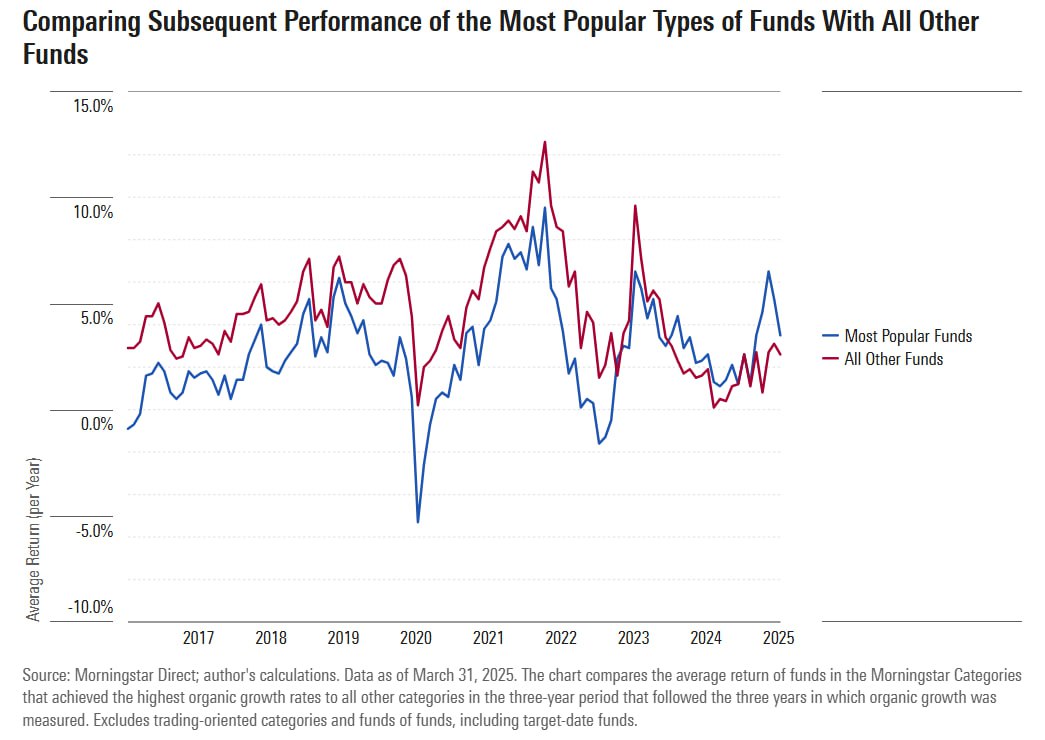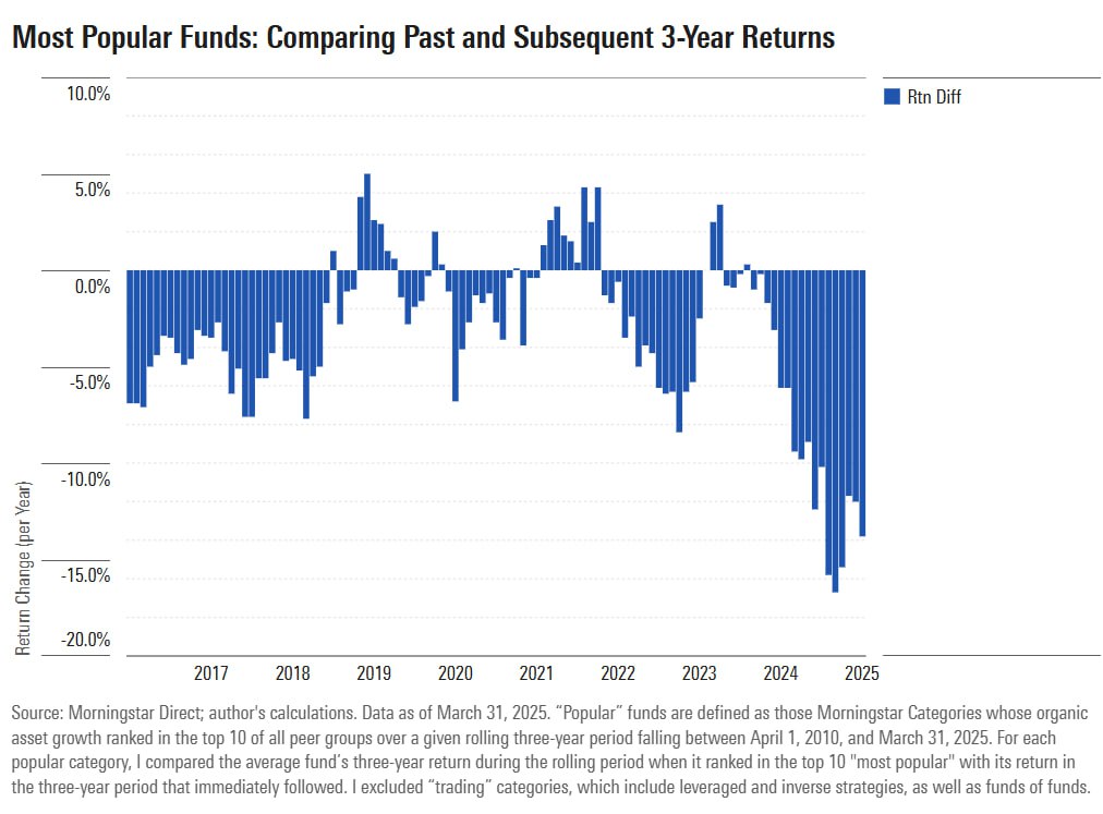 1) На первом графике «Популярные» фонды определялись как категории фондов Morningstar, рост активов которых вошел в десятку лучших среди всех групп-аналогов за каждый 3-летний период с 1 апреля 2010 г. по 31 марта 2025 г. Для каждой популярной категории Птак сравнил среднюю 3-летнюю доходность фонда за скользящий период, когда он входил в десятку «самых популярных», с его доходностью за трехлетний период, который последовал сразу за ним. В большинстве случаев в последующие три года доходность фондов существенно снижалась (график 1).
