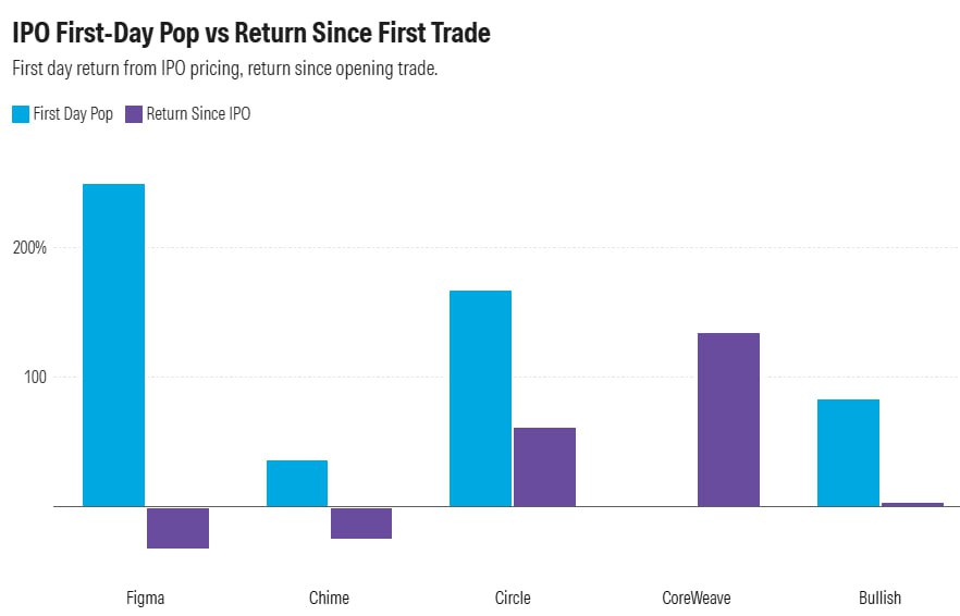 Драйверами интереса к IPO выступают акции компаний, связанных с искусственным интеллектом и криптовалютами. От Circle Internet Group (CRCL), эмитента стейблкоинов, до компании CoreWeave (CRRWV), занимающейся разработкой ИИ. Акции Figma выросли на 250% в первый день торгов, а CoreWeave — более чем на 130%. Как показывает аналитик MS (см. график выше), высокая недоооценка первого торгового дня в краткосрочной перспективе, как правило, сопровождается низкой последующей доходностью акций с момента IPO. Акции Figma сейчас торгуются по $73, снизившись на 33%. Акции Chime упали на 25% с момента своего дебюта. CoreWeave, разочаровавший в свой первый день торгов в марте, теперь вырос на 135%. Circle вырос на 62%, а Bullish — на 4%.