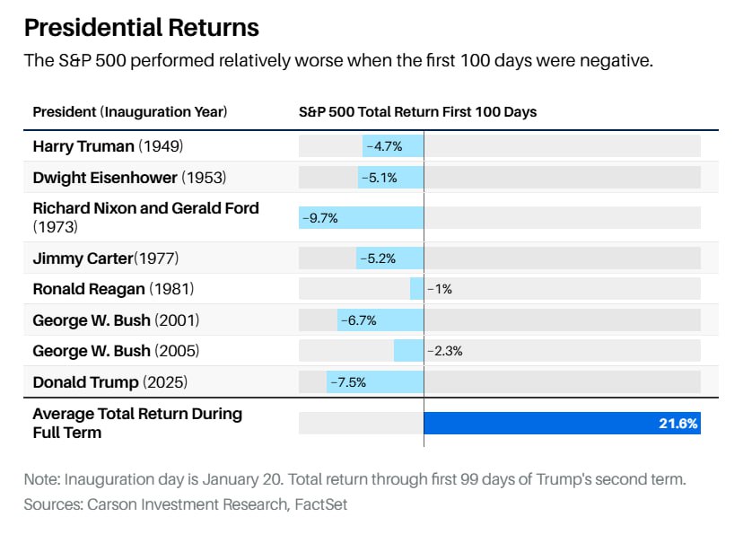По состоянию на 28 апреля 2025 г. индекс S&P 500 упал на 7,8% с момента инаугурации Трампа. В последний раз фондовый рынок работал так плохо при Никсоне в 1973 году, когда S&P 500 упал почти на 10% за первые 100 дней.