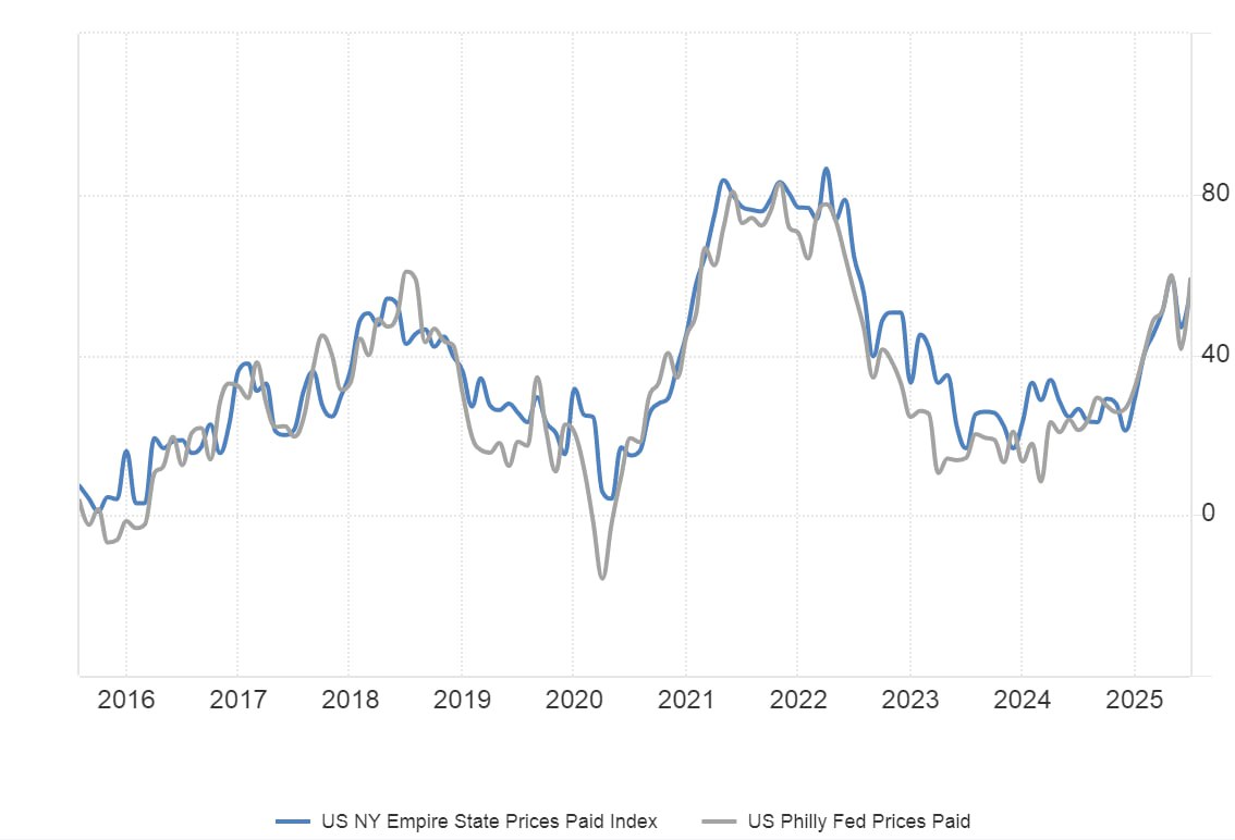 ✔️Настроения бизнеса тоже улучшились – индексы деловой активности ФРБ Нью-Йорка и Филадельфии выросли, но на фоне растущих закупочных цен. Компании пока только частично перекладывают рост издержек в цены, о чем и говорят опросы ФРС: