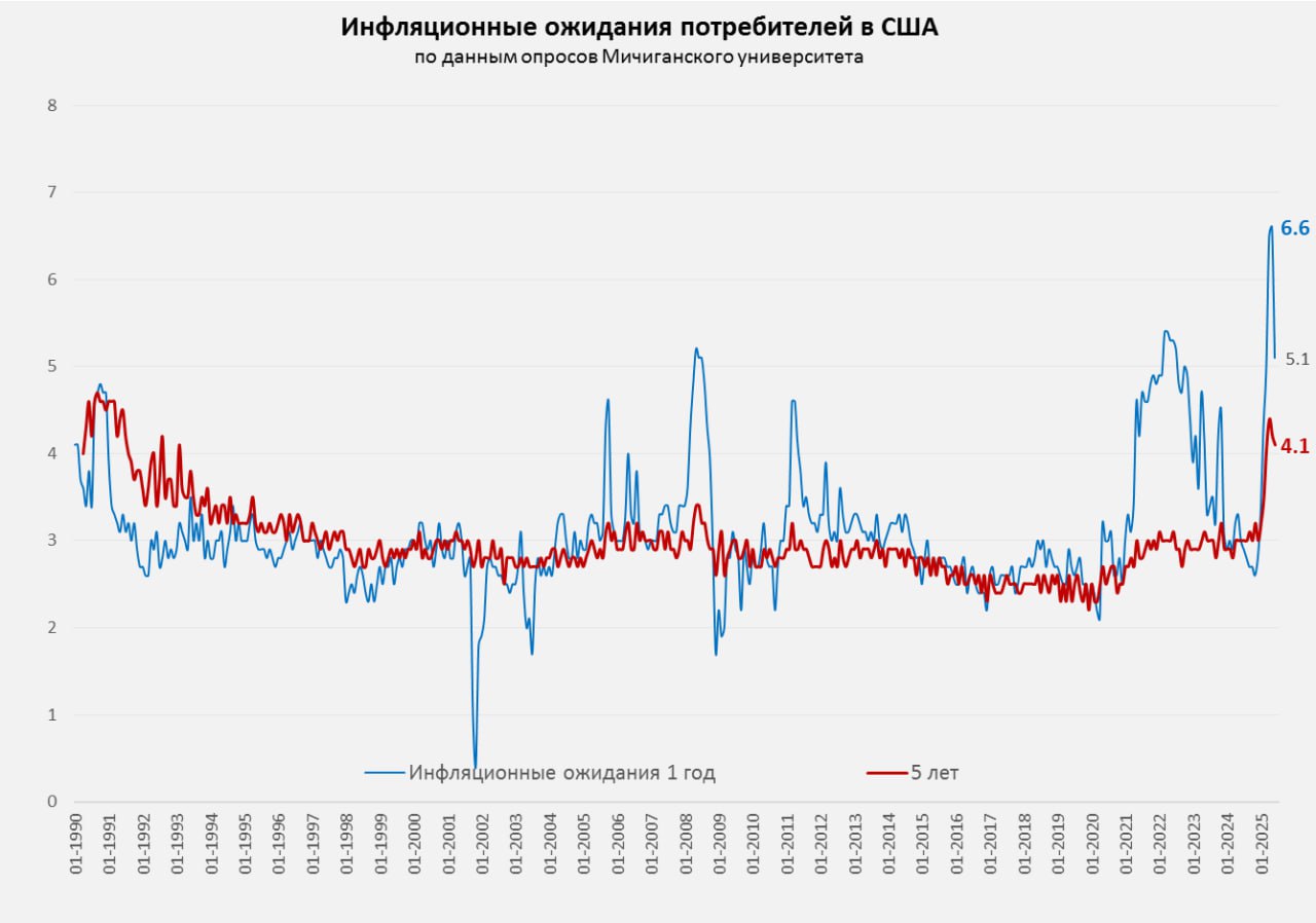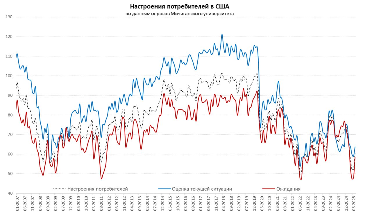 Данные Мичиганского университета по настроениям американских потребителей в начале июня подтвердили сильную зависимость настроений от пошлин: индекс ожиданий резко отскочил с 47.9 до 58.4, оценка текущей ситуации подросла скромнее с 58.9 до 63.7. Увидев, что Трамп готов быстро давать задний ход как только ситуация начинает резко ухудшаться, потребитель немного успокоился.