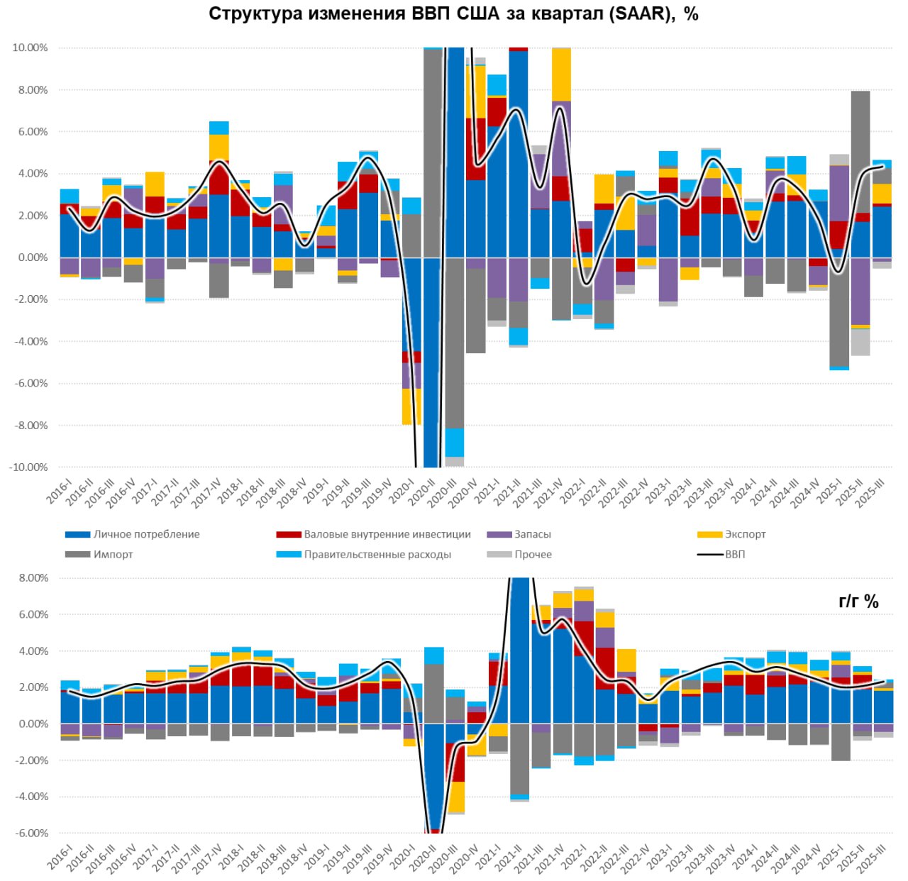 BEA, наконец, смог опубликовать данные по ВВП США за III квартал, рост составил 1.1% кв/кв (4.3% SAAR - здесь и далее), годовой прирост ВВП немного ускорился до 2.3% г/г.