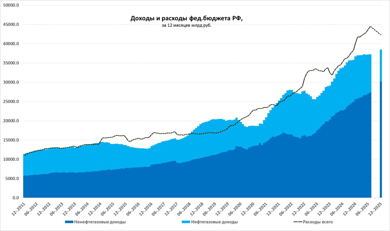 За последние 12 месяцев доходы бюджета ₽37.3 трлн (план ₽38.5 трлн), но расходы растут быстрее и составили ₽44.5 трлн (план ₽42.3 трлн, и ₽42.9 трлн с учетом дополнительных ННГД), накопленный за 12 месяцев дефицит расширился до ₽7.25 трлн (план ₽3.8 трлн).