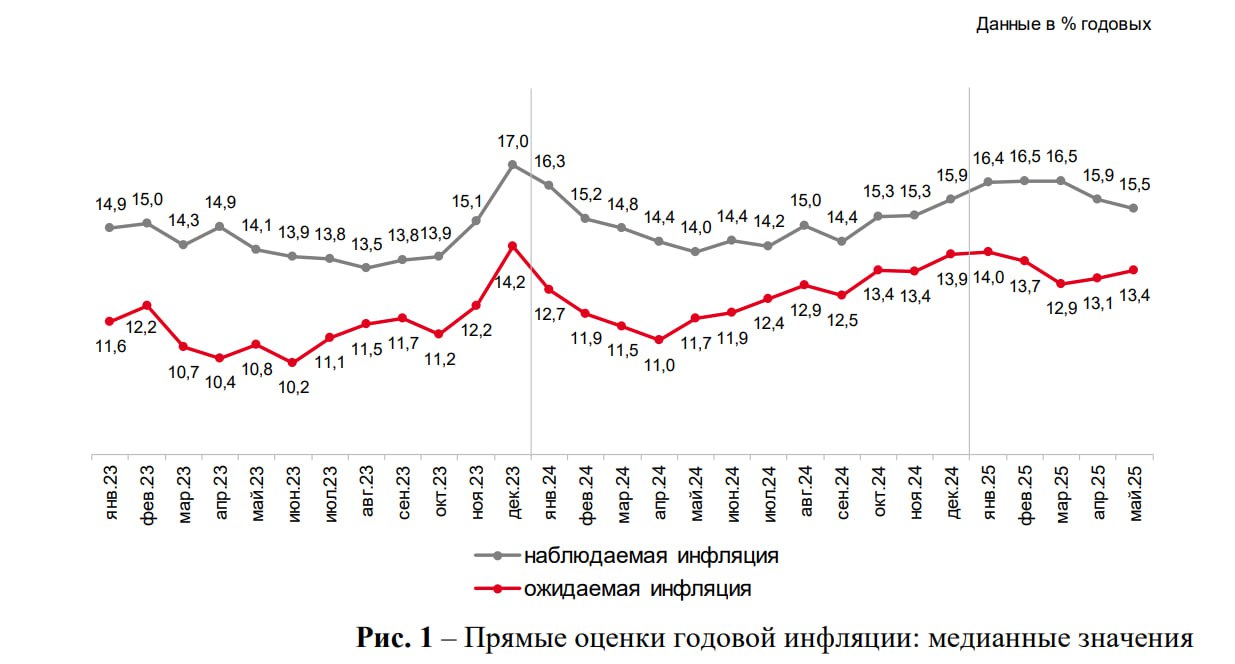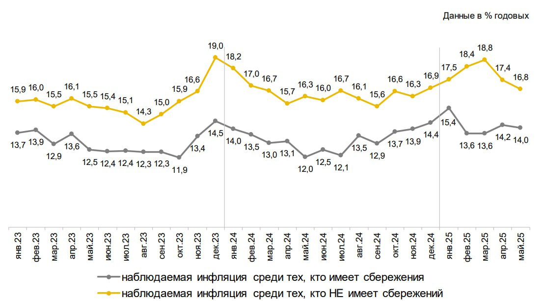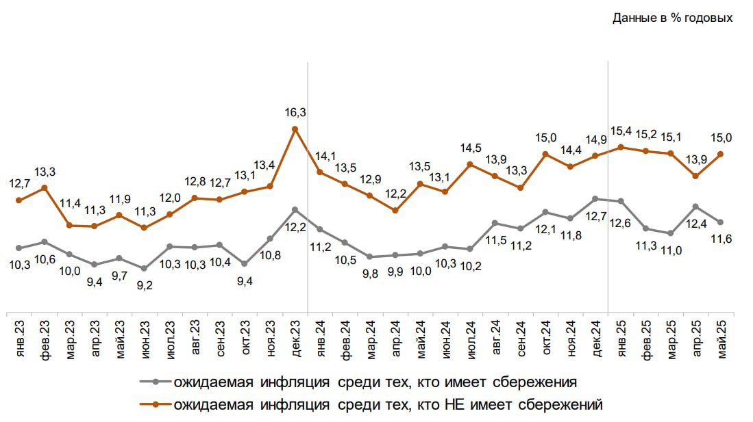 - Респонденты без сбережений, наоборот, повысили свои ожидания инфляции с 13.9% до 15%, а их оценки наблюдаемой инфляции снизились с 17.4% до 16.8%.