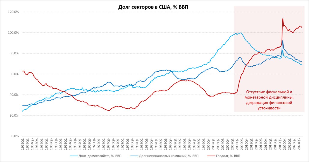 Сейчас доля госдолга в общем долге нефинансового сектора на максимумах с 1950-х годов и близка к 45%. ФРС собрала убытка по портфелю ценных бумаг за последние годы на ~$240 млрд.
