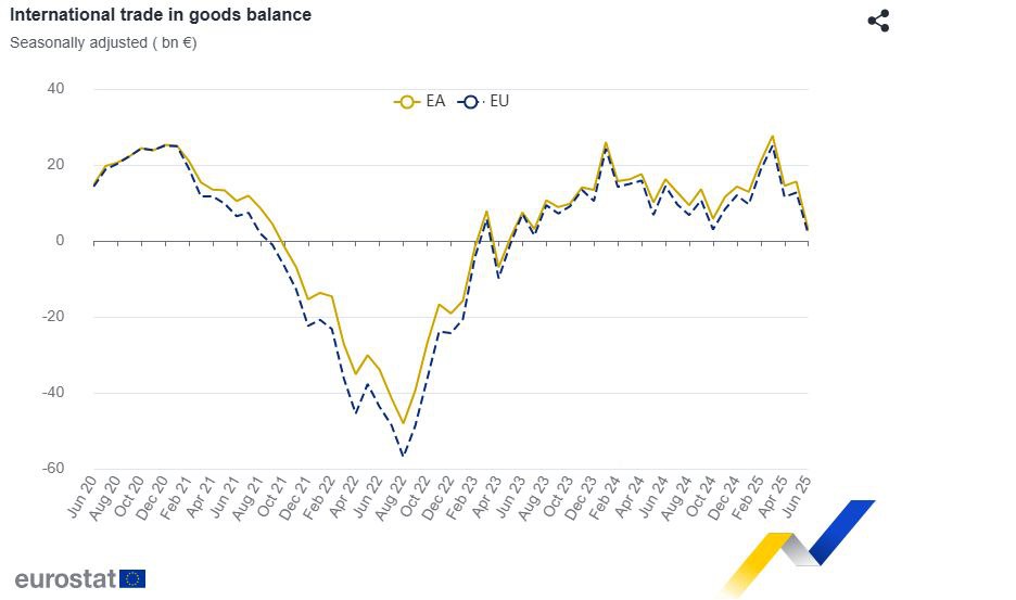 Уже в июне торговый баланс Еврозоны провалился до двухлетних минимумов €2.8 млрд. Отчасти это, конечно, провал после таоифного всплеска. Но резкое ухудшение торгового баланса в июле произошло с двумя ключевым партнёрами ЕС - США и Китай.