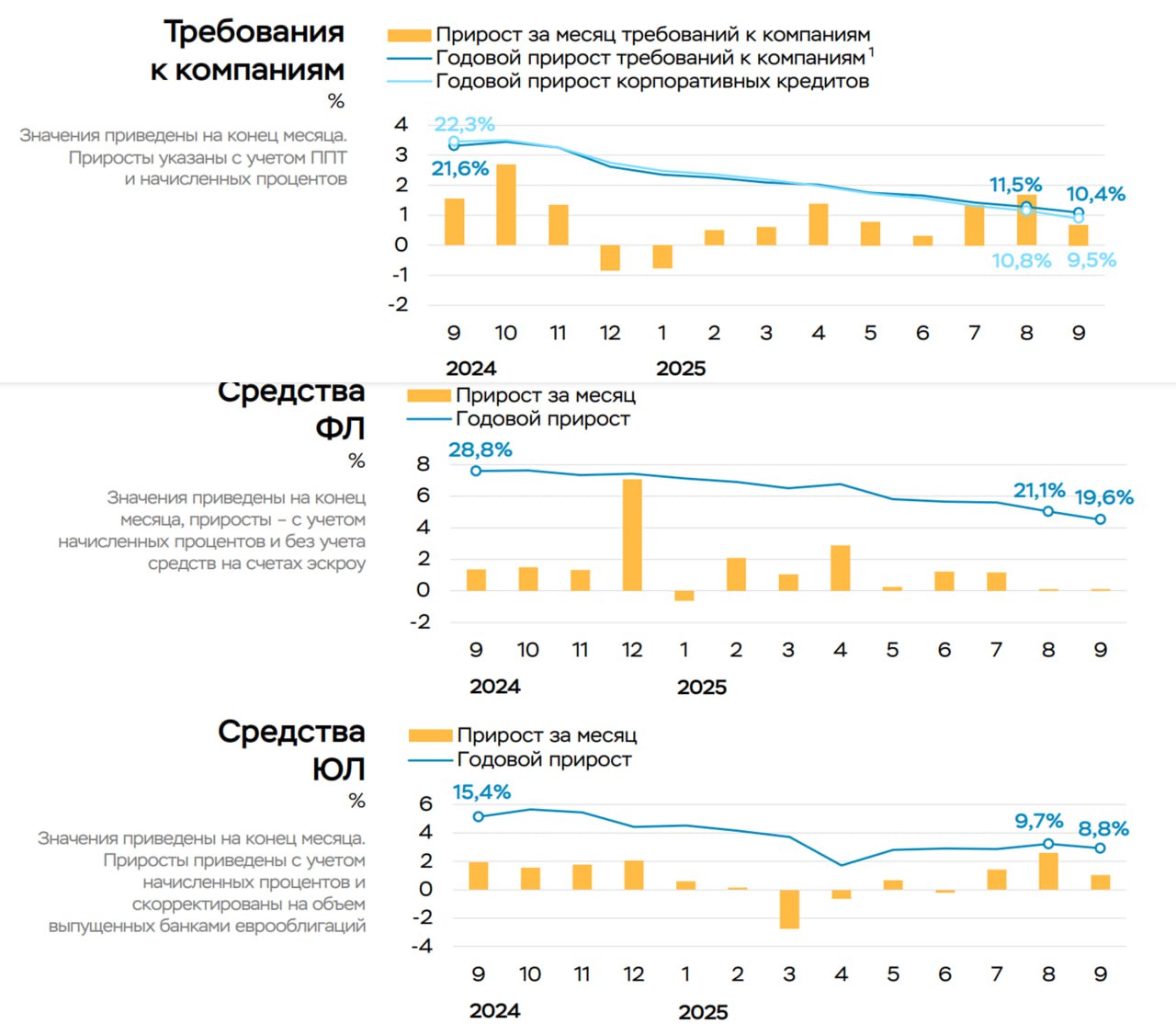 После бурного роста кредитования компаний во второй половине лета кредит немного успокоился, но идет ближе к верхней границе прогноза Банка России. Причем весь прирост кредита - это Сбер, судя по его отчетности.