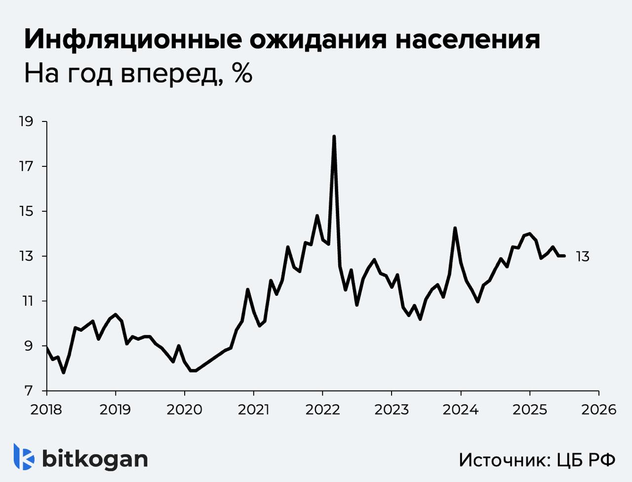 ▪️Ожидания населения относительно роста цен на год вперед остались неизменными на уровне 13,0%. А это высокий уровень.