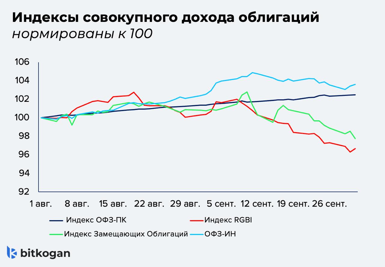 ◽️Рынки, понятное дело, нервничают. За два месяца индекс цен гособлигаций RGBI потерял больше 3%. Под давлением остаются и замещающие облигации — сказывается укрепление рубля.