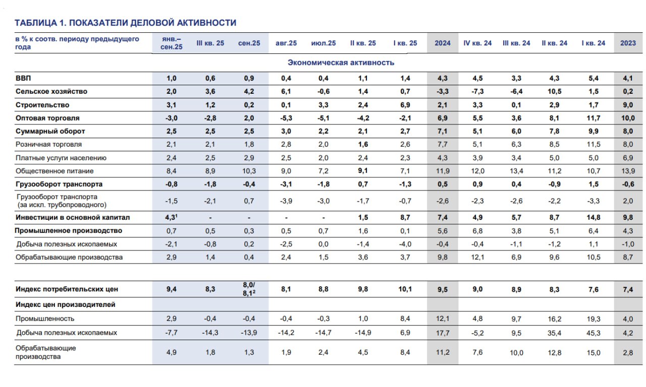 По оценкам Минэкономразвития, ВВП ускорился до 0.9% г/г в сентябре после 0.4% г/г в августе, а в 3кв25 рост составил 0.6% г/г после +1.1% г/г в 2кв25 и +1.4% г/г в 1кв25 (видимая тенденция на замедление) и около +1.0% г/г за 9м25.