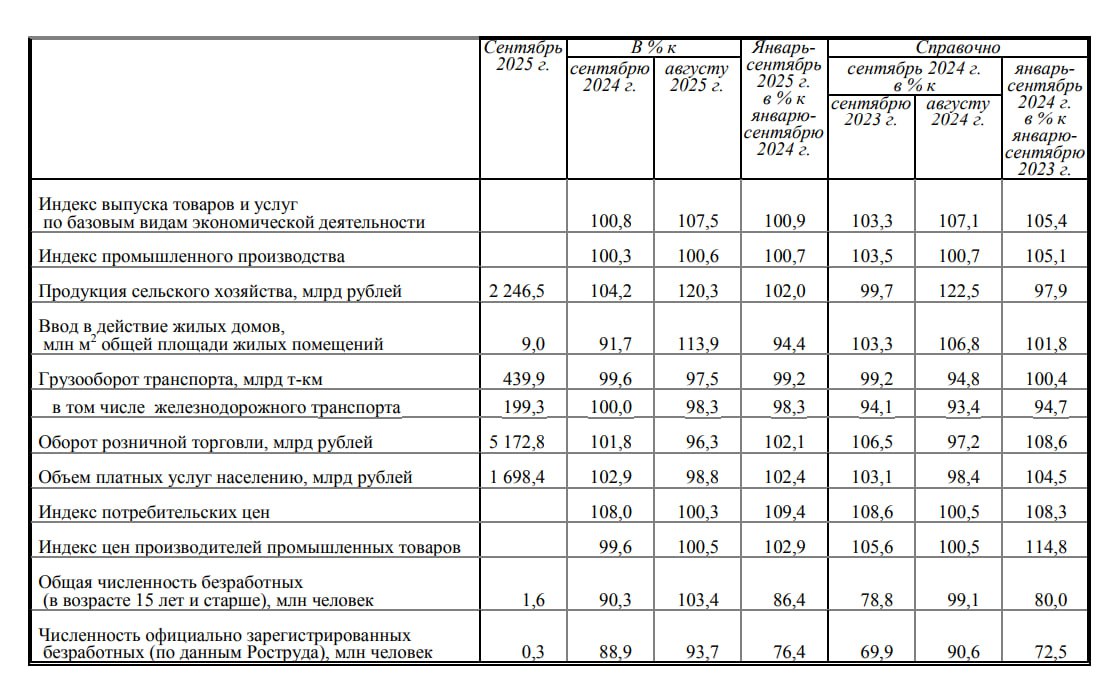 Индекс выпуска по базовым видам экономической деятельности вырос на 0.84% г/г в сентябре после 0.43% г/г в августе, за 3кв25 +0.5% г/г после +1.2% г/г в 2кв25, +3.9% к 3кв23 и +14.6% к 3кв19.
