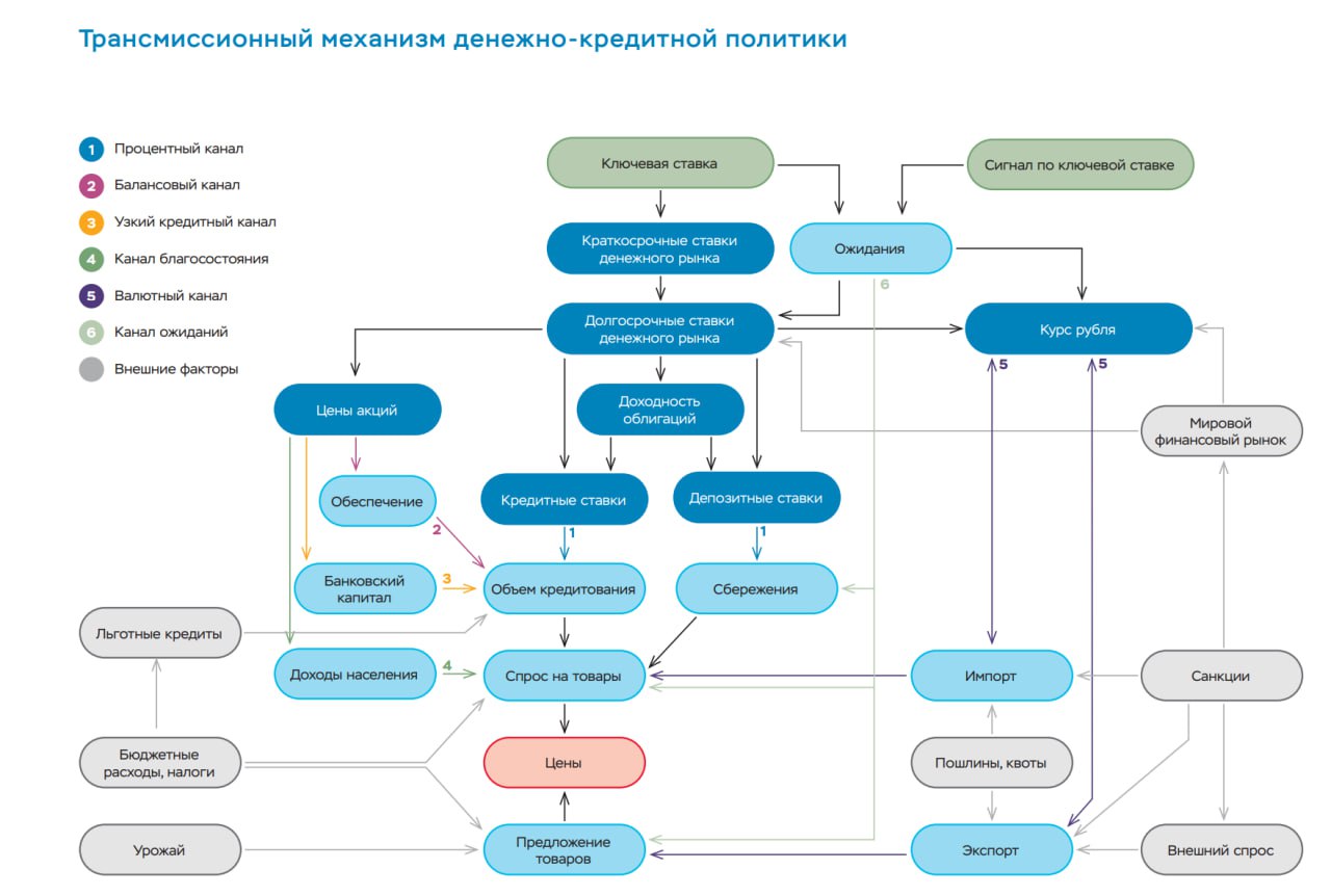 Отдельные цепочки причинно-следственных связей, обеспечивающие такой результат, называются каналами трансмиссионного механизма денежно-кредитной политики или иначе говоря, как комплекс взаимосвязей между экономическими процессами, позволяющий воздействовать на инфляцию через изменение ключевой ставки центрального банка.