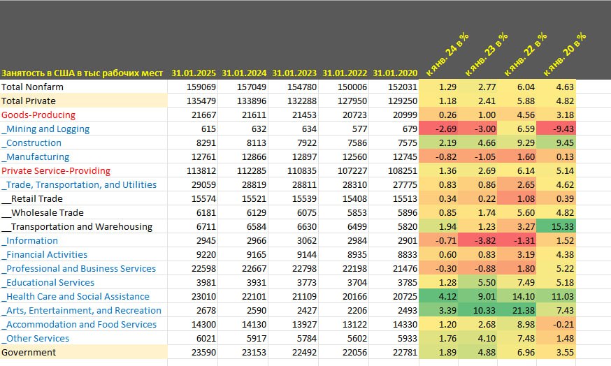 В частном секторе прирост рабочих мест составил 0.08% м/м в янв.25, за последние три месяца – 0.16%, за полгода – всего 0.11%, за последние 12 месяцев – 0.10% vs 0.12% в 2023, 0.27% в 2022, в среднем 0.13% в 2017-2019 и 0.16% в 2011-2019.