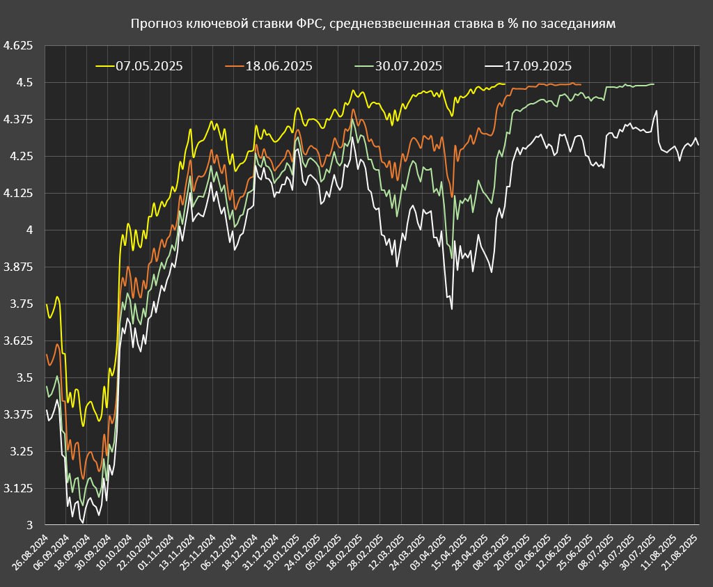 На основе прогноза ключевой ставки (FedWatch), рассчитанной через цену фьючерсов на ставку федеральных фондов, после выступления Пауэлла вероятность снижения ставки 17 сентября составляла 84.7% или 4.29% - средневзвешенная ставка, днем ранее 4.31%, в среднем в августе – 4.28% vs 4.33% в июле и 4.28% в июне (изменения в пределах погрешности, выступление Пауэлла никак не повлияло), а с середины мая оценки ставки на сентябрьском заседании достаточно стабильны в узком диапазоне.