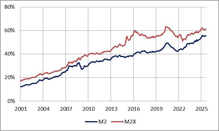 И последнее. На сегодня денежная масса M2 составляет 55% от ВВП, М2Х чуть больше 60. Но эти значения включают наличные и средства компаний, поэтому общий объём долговых активов в распоряжении домохозяйств не превышает 50% от ВВП даже с учётом всех облигаций. В самом деле, уровень долга в стране по мировым меркам очень низкий. Но именно в этом и состоит проблема! Невысокий уровень долга свидетельствует вовсе не о консерватизме заёмщиков, как это преподносится в блогах и СМИ, а исключительно об отсутствии достаточного количества кредиторов и, как следствие, ограниченной ёмкости рынка. Так получается, что ежегодные заимствования правительства даже 2-3% от ВВП – прогнозируемый дефицит бюджета в этом году – уже являются для рынка непосильной ношей. Заимствования в 4-5% от ВВП, по моему мнению, и вовсе чреваты полноценным кредитным коллапсом, причём очень быстро – на горизонте 1-2 лет. Если так, то от успеха политики по преодолению дефицита бюджета сейчас, действительно, зависит очень многое.