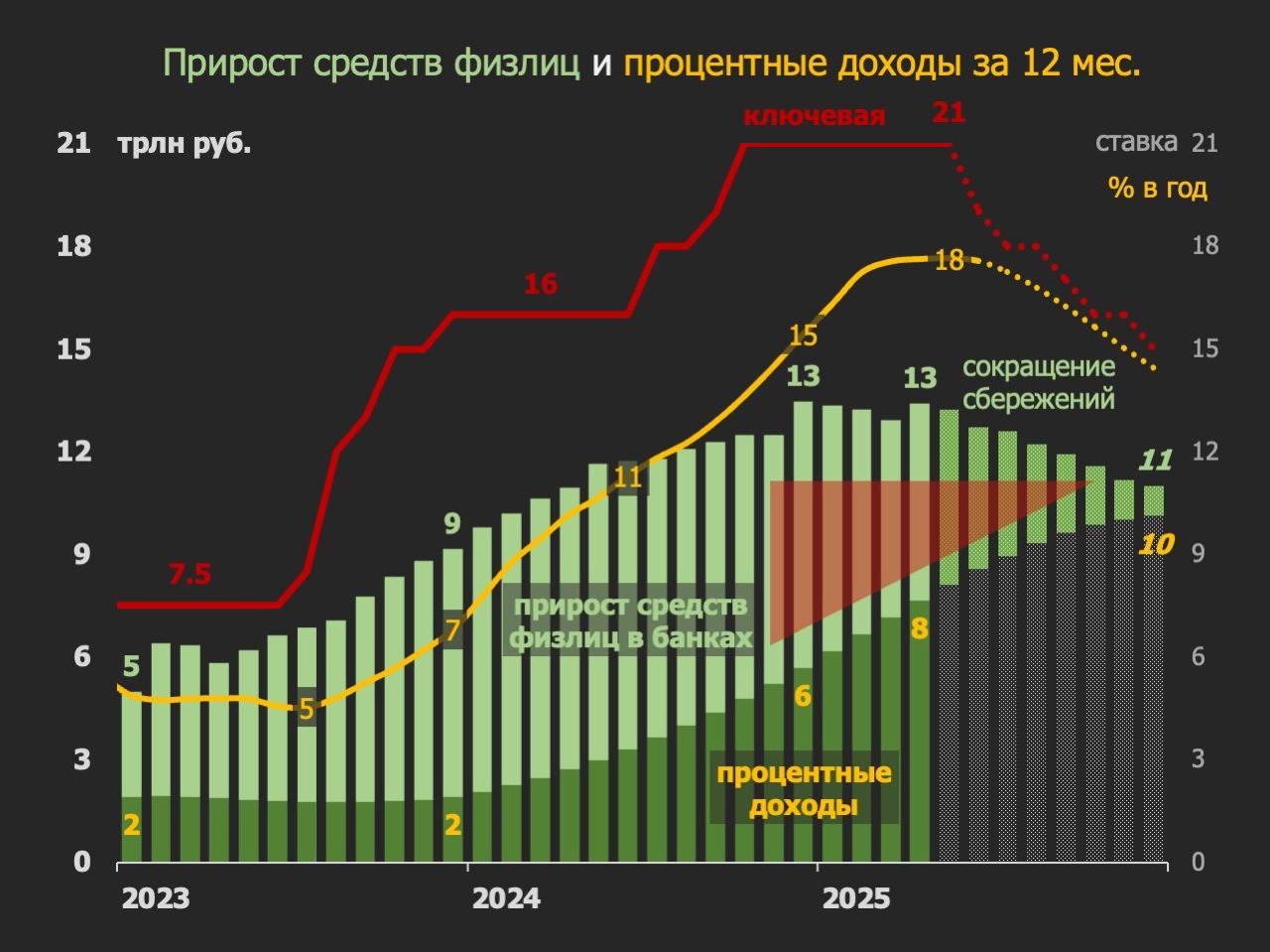 Если учесть динамику процентных доходов, то приток депозитов из других доходов почти обнулился (проинфляционно). Проценты приносили 2 трлн в 2022-2023, 6 трлн в 2024 и >10 трлн будет в 2025. Прирост средств физлиц за год может снизиться с 13 до 11 трлн по итогам 2025 (а по верхней границе ЦБ до 8 трлн +14%).