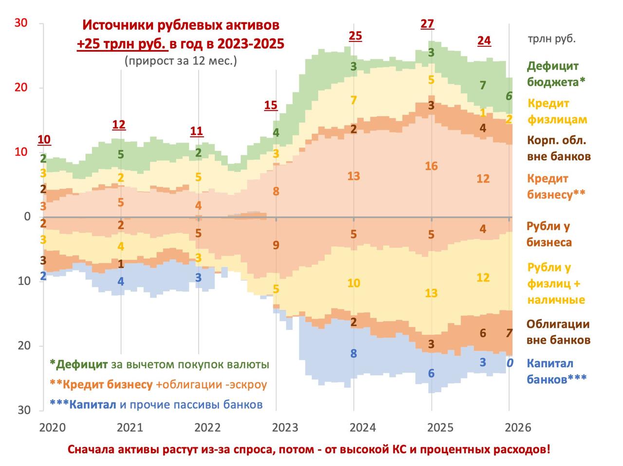 Почти два года прошло от первой версии этого графика. Удивительно, что рост ключевой ставки до 16-21% никак не замедлил рост рублевых активов. Все также источники их создания (дефицит бюджета, кредит бизнесу и физлицам, включая облигации) дают прирост около 25 трлн руб. в год.