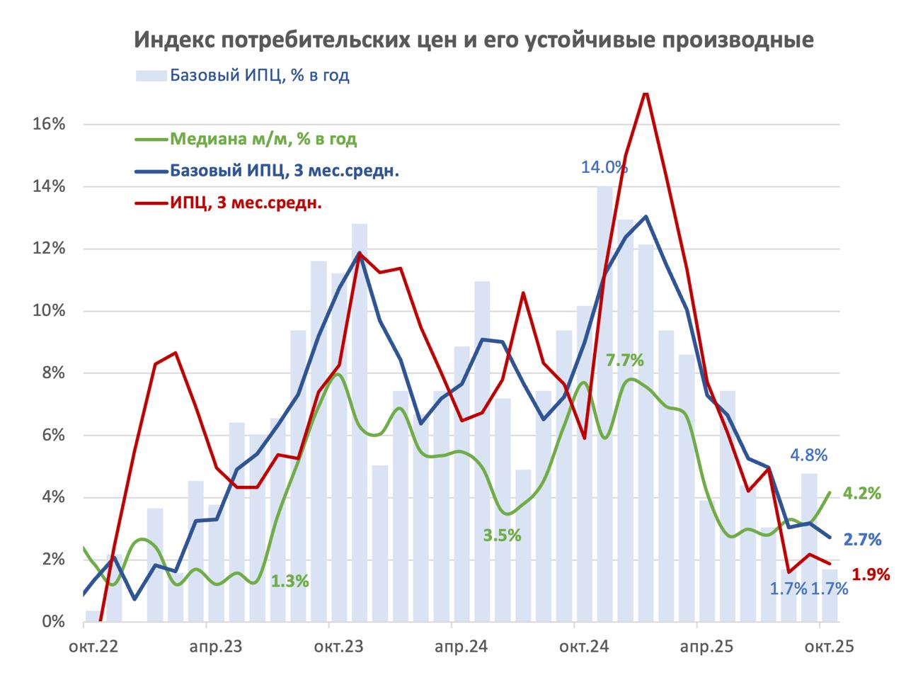 ▪️Медиана индексов цен по широкой корзине выросла в октябре с ~3 до 4,2%. Причина во многих продах, где есть сезонность.