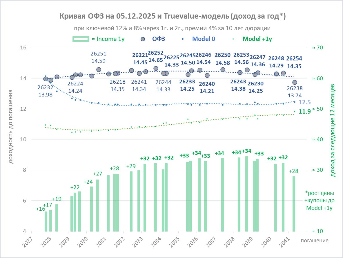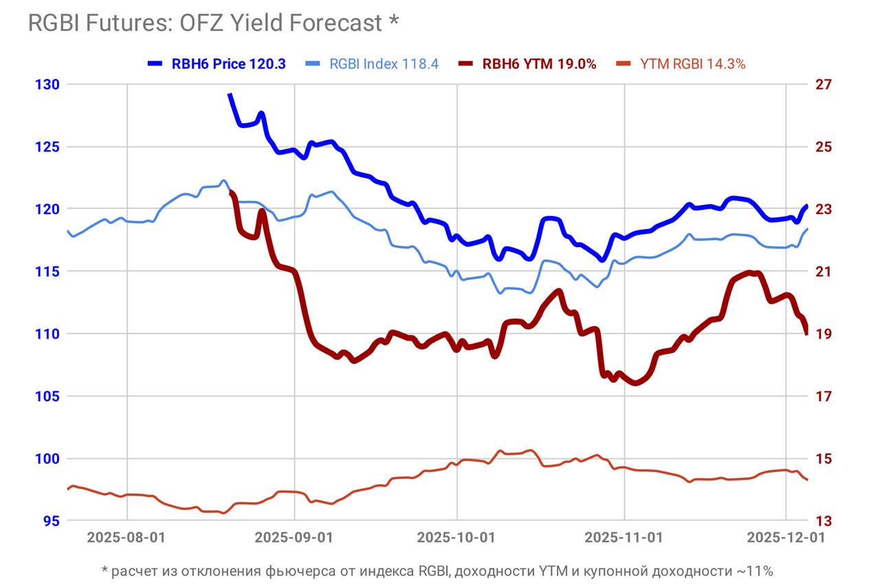 Ожидаемая доходность меняется во времени. В августе она была слишком высока (23% годовых при фьючерсе 129 до марта 2026 и индексе RGBI 122), а сейчас низка - 19% при потенциале в ОФЗ до 30% за год.