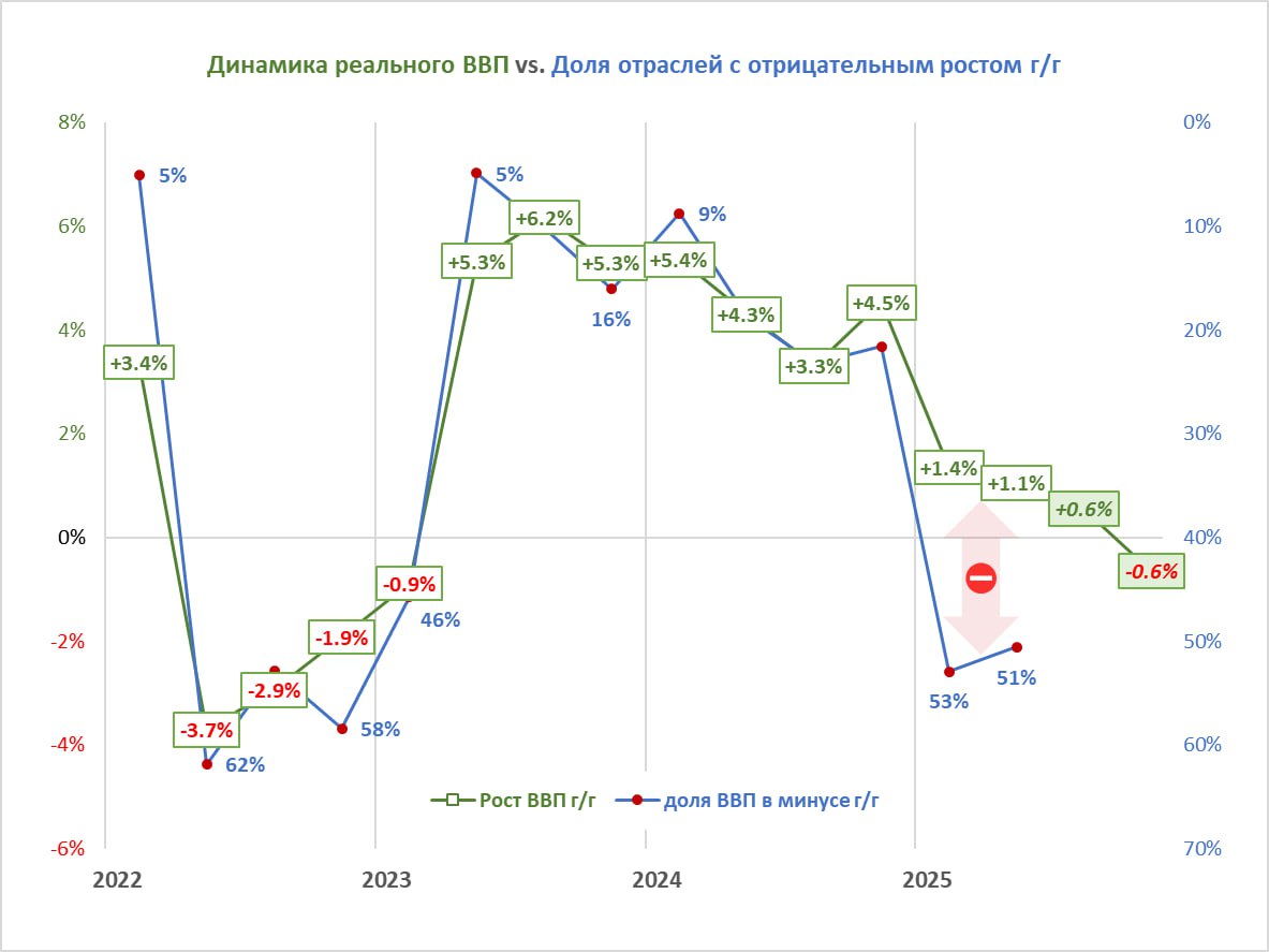 На уровне ВВП больше 50% отраслей по весу в минусе г/г, что характерно для отрицательного роста ВВП, как в 2022 (график). Но "выкрутасы" в статистике не дают опуститься в минус общему индексу.