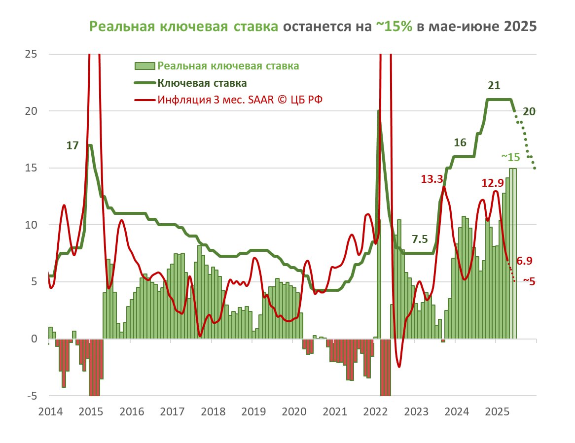 Снижение ключевой ставки на 1 п.п. до 20% сделано по самому жесткому из возможных сценариев. В результате реальная ставка* повысится с 13-14% в марте-апреле и обновит мировой рекорд в мае-июне 2025 на ~15%
