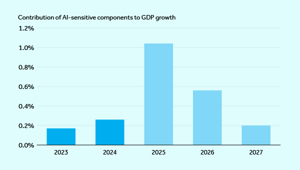 Между тем, в ближайшие годы вклад инвестиций в ИИ в ВВП США снизится – такие факторы, как снижение потребления из-за повышения тарифов и предложения рабочей силы из-за сокращения иммиграции будут сдерживать экономический рост. Несмотря на оптимизм по поводу того, что ИИ навсегда повысит структурную производительность, экономисты Barclays считают, что это вряд ли произойдёт только за счёт капитальных затрат.