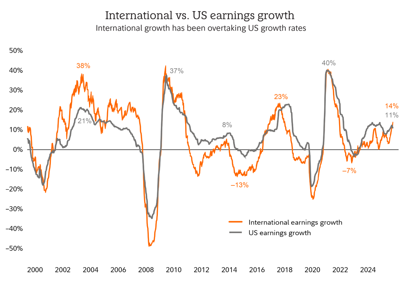 Аналитик напомнил, что, несмотря на хороший рост в 2025 году, международные акции по ряду показателей остаются привлекательными. В частности, рост прибыли за пределами США сейчас выше, чем в США, что даёт инвесторам убедительные альтернативы индексу S&P500.