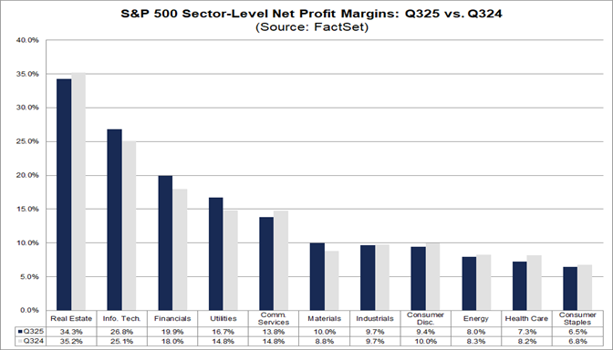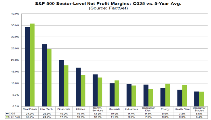 Норма чистой прибыли для S&P500 за 3-й квартал 2025 года составила почти 13%, что соответствует норме чистой прибыли за предыдущий квартал, но превышает норму чистой прибыли за прошлый год и средний показатель за последние 5 лет.