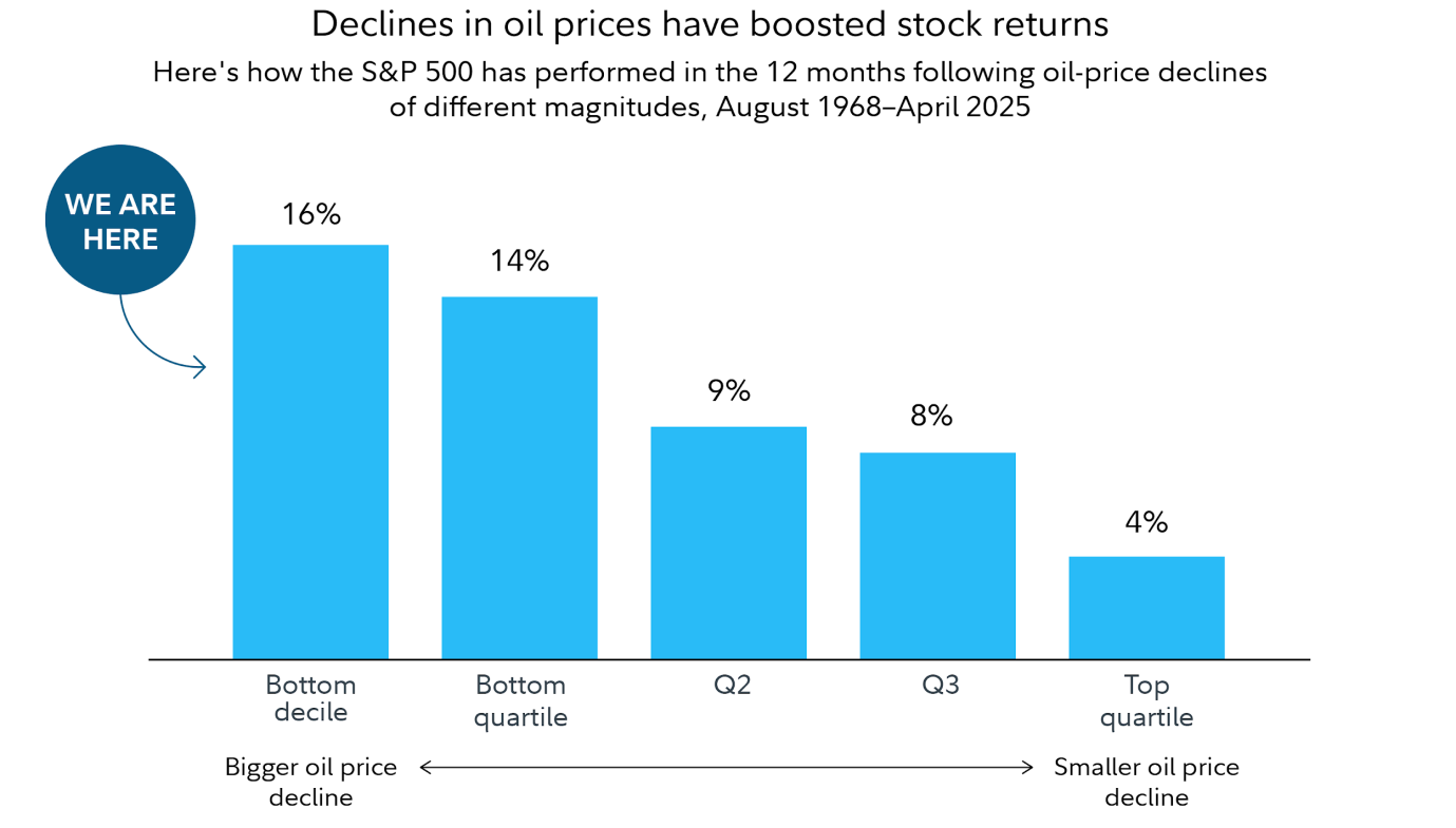 1. Дешёвая нефть компенсирует негативное влияние тарифов. В Fidelity предупредили, что инвесторы чрезмерно сосредоточены на тарифах, в то время, как они игнорируют другую тенденцию – дешёвую нефть. В последнее время цены на нефть снизились примерно на 30% по сравнению с предыдущим годом и более чем на 50% по сравнению с пиком 2022 года. Дешёвая нефть может стать мощным стимулом для потребителей, действуя почти как снижение налогов.