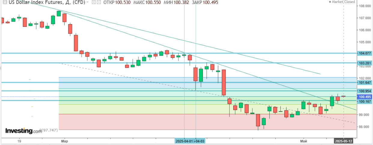 В результате оправдывается мой прогноз в Finversia 29 апреля о наиболее актуальном сценарии по индексу доллара USDX: «В случае преодоления вверх рубежа 100 п. вероятно движение к 100,9 п.» Показатель действительно поднялся выше 100 п., к 100,7 п.