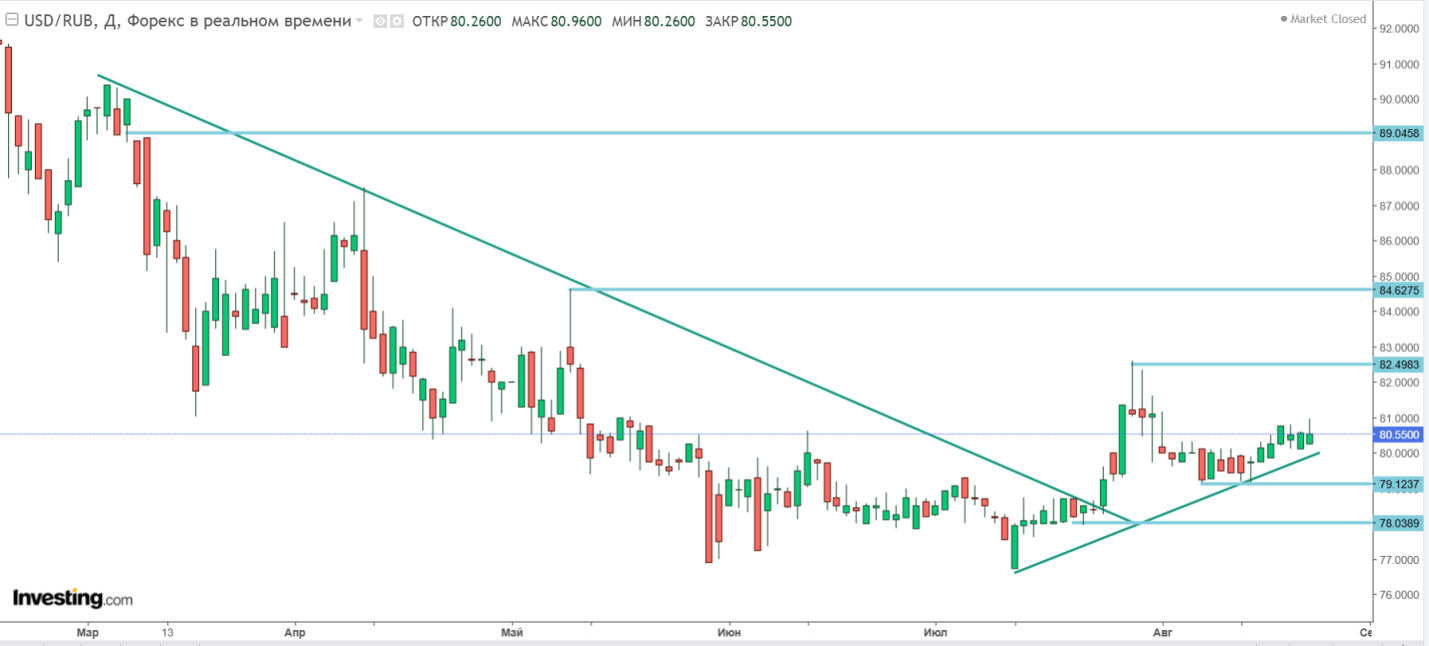 Таким образом, эти и иные факторы в большей мере направлены против рубля. Поэтому вероятно его плавное снижение. Процесс контролируется центробанком, в частности, объёмами предоставляемой ликвидности в банковской системе. И хотя курс имеет ограниченное рыночное формирование, можно обозначить технические перспективные уровни. При отсутствии форс-мажоров предполагаю подъем доллара в сентябре в диапазон 80-82,5 руб./$ и к 84,5-89 руб./$ в перспективе полугодия. Уровни поддержки находятся в районе 78,1–79,1 руб./$.