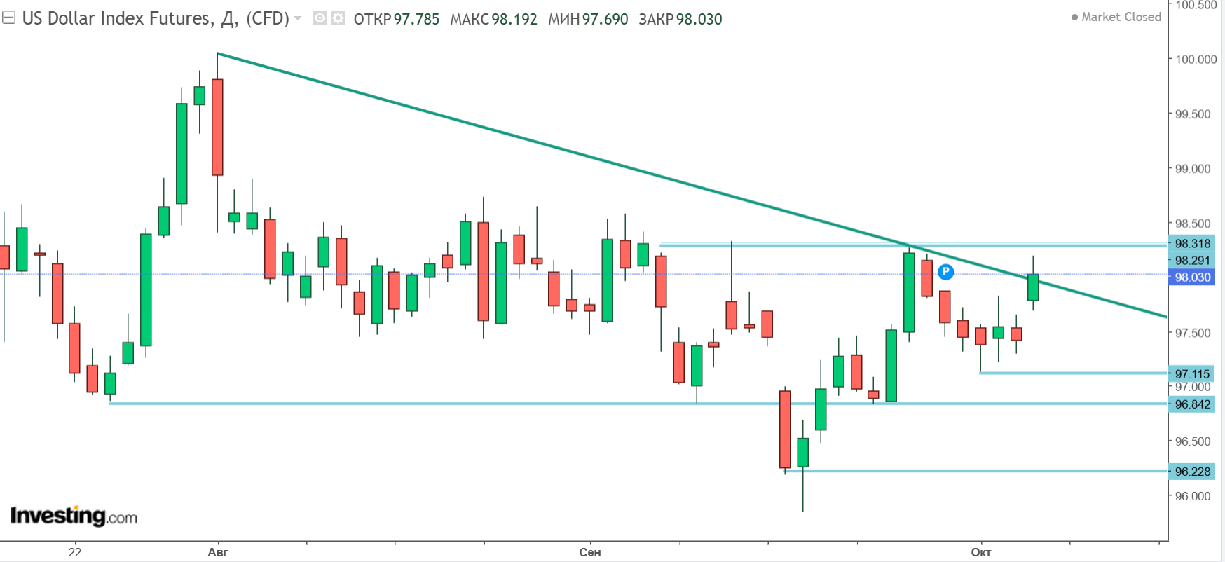 Это способствовало в начале октября новому ослаблению доллара в рамках общего тренда. Индекс USDX отошёл от локального максимума 98,3 пункта к 97,1 п.