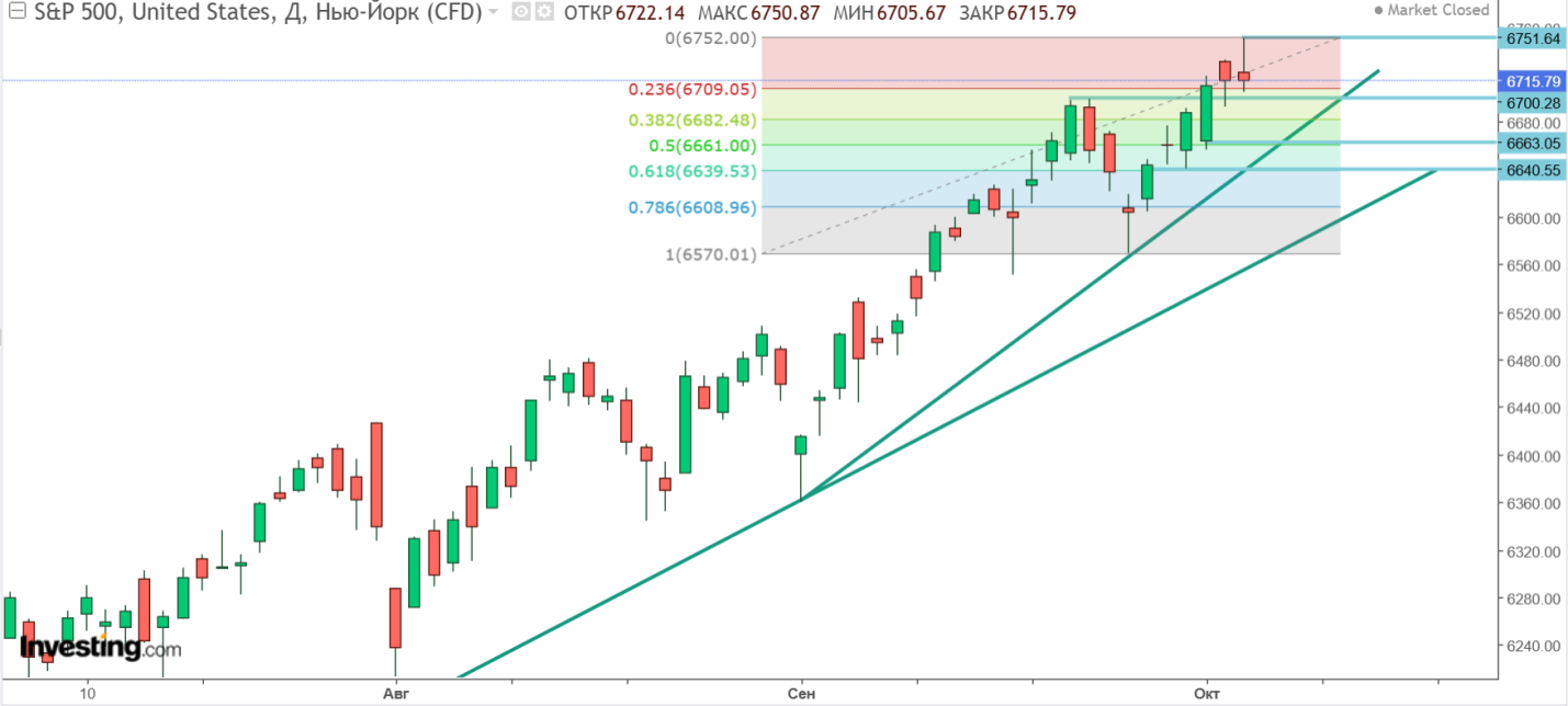 Для S&P500 пробитие вверх предыдущего максимума 6700 пунктов означает усиление восходящего тренда. Но есть уже опасность покупок на таких высотах. С технических позиций после импульсного пробития стоит рассматривать возможность коррекции вниз и ждать новый импульс в случае подхода к поддержкам 6640-6665 пунктов. Там зоны Фибоначчи 50% и 61,8%. А 6751 п. сейчас – сильное сопротивление.