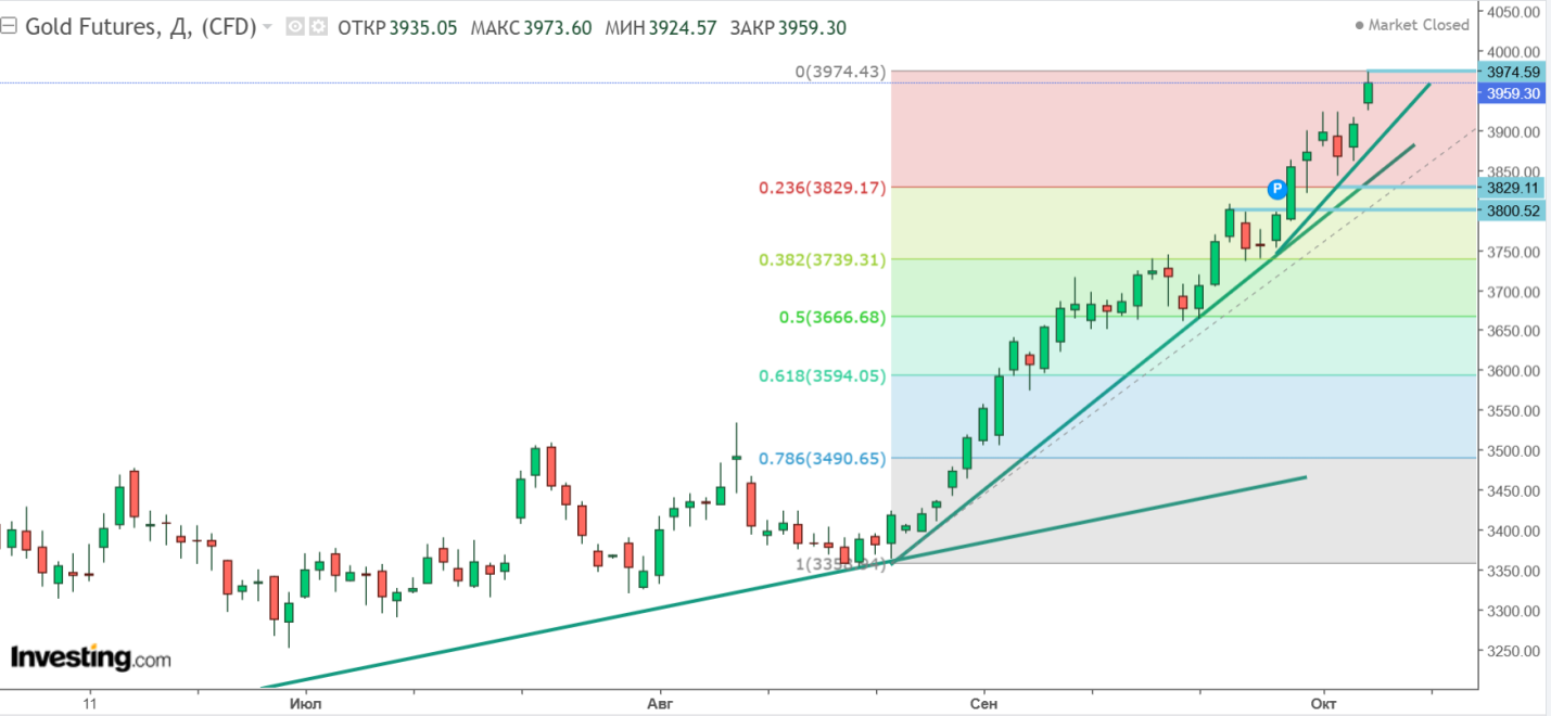 Ну а для золота, как мы много раз говорили, всё происходящее – благо. Ждём уменьшение ставки и ослабление доллара – это за золото. Шатдаун и риски экономики Штатов – отлично, за золото. Долговые проблемы в тех же США и Европе, беседы о конфискации российских активов в долларах и евро, тоже за золото. Правительственные передряги в Европе и Азии – тоже плюс для него. Вот вам, пожалуйста, очередной мировой рекорд – получите цену больше $3974 за унцию. Восходящий тренд только усиливается. Для него тоже политика довлеет над экономикой.