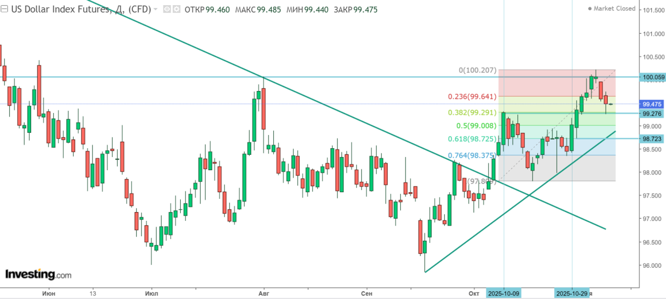 Факторы складываются в основном против доллара. Не случайно индекс USDX не ушёл выше 100 п. Не смог! Это принципиальный рубеж. Не только психологический ровный, но и технический. Именно от него в августе начался последний импульс ослабления «зелёного». И с технических позиций превышение этого сопротивления дало бы разворот всего нисходящего тренда 2025 года.
