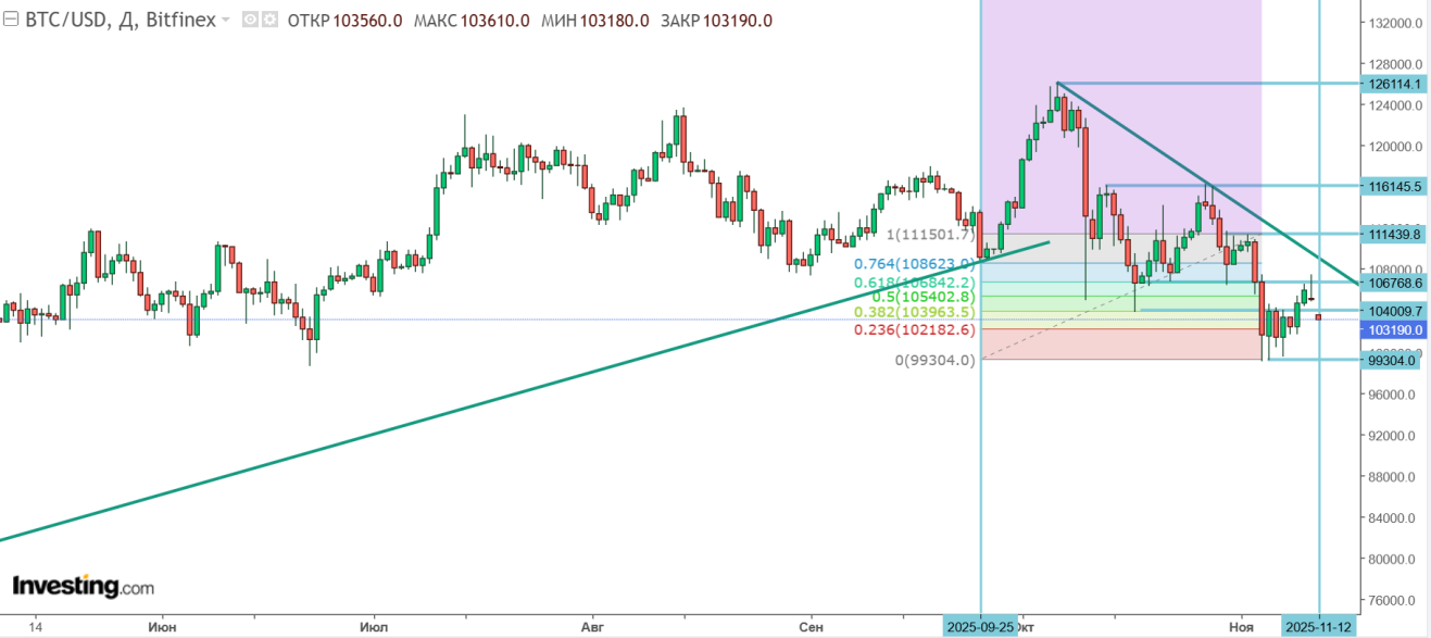 И здесь очень важный момент. Вот у доллара годовой тренд технически не поменялся. А у биткоина после октябрьского и ноябрьского обрушения со $126 тыс. направление сменилось на нисходящее, чётко понижаются максимумы и минимумы. Биткоин более волатильный, и его испуг привёл к развороту годовой тенденции. Возможность окончания шатдауна подняла было монету уже в коррекции вверх – к $106800, сопротивлению по Фибо 61,8% и прошлому экстремуму октября. Но попытка пробить его тоже не удалась. 12 ноября криптовалюта снова ушла ниже поддержки $104 тыс. Так что по технике снова можем пойти к сакраментальной сотне и ниже. Альтернативный сценарий, менее вероятный, подъём выше $106800 – путь к сопротивлению $111500. Более глубокая коррекция к началу последнего импульса даунтренда. Да, тренд теперь остаётся нисходящим.