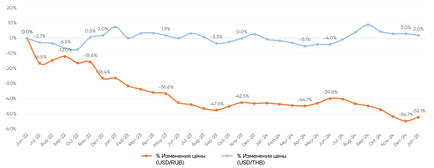 Динамика изменения курсов рубля и тайского бата к доллару США с июня 2022 по январь 2025 года. Видно значительное ослабление рубля (до –54,7%) на фоне относительной стабильности тайского бата.