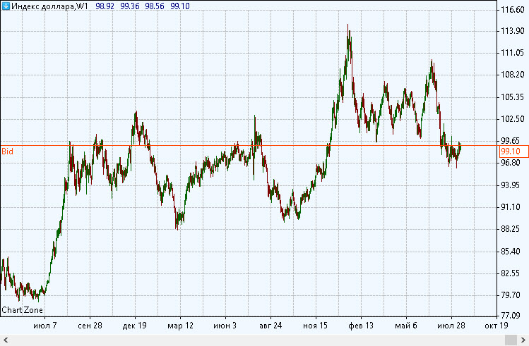 Рынки отреагировали на итоги заседания умеренно негативно, так как уловили, что краткосрочная доходность будет снижаться медленнее, чем ожидалось. Доллар немного усилился. Мы ожидаем в ближайшие недели умеренной восходящей коррекции доллара, индекс доллара (DXY) пробьет вверх 100 и имеет потенциал роста до 102 (см. график 1)