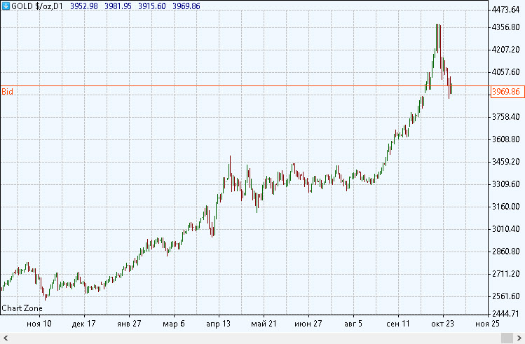 Драгметаллы. На рынке драгметаллов резкая коррекция перешла в умеренную. Перекупленность на всех младших таймфреймах, включая недельный, снята. Учитывая вводные от ФРС и предполагаемую динамику доллара в ближайшие недели, мы не ждем дальнейшего развития сколько-нибудь глубокой коррекции в золоте. Мы полагаем, что район $3850 (это середина волны роста, которая шла с конца августа по середину октября) выступит нижней границей диапазона будущей консолидации, от которого золото оттолкнется (см. график 2).