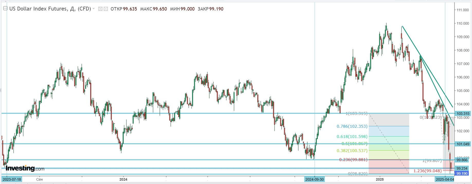 В реальности доллар от 103,2 пункта действительно пошёл вниз 8 апреля. Эти первые цели он не только достиг, но и «перестиг», уйдя ниже принципиального рубежа 100 пунктов. к минимумам с июля 2023 года.