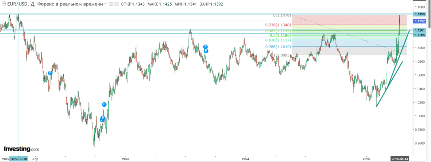 Для EUR/USD ситуация такова. Резкий взлёт пары упёрся в невероятный уровень 1,15 – максимум с февраля 2022 года. Из-за отскока от него вниз к 1,14 создаётся более высокая возможность коррекции к рубежам 1,1210-1,1260 – предыдущим экстремумам и уровням Фибоначчи 38,2% и 50%. Ну а зоной сопротивления в случае подъёма актива выступает снова 1,15.